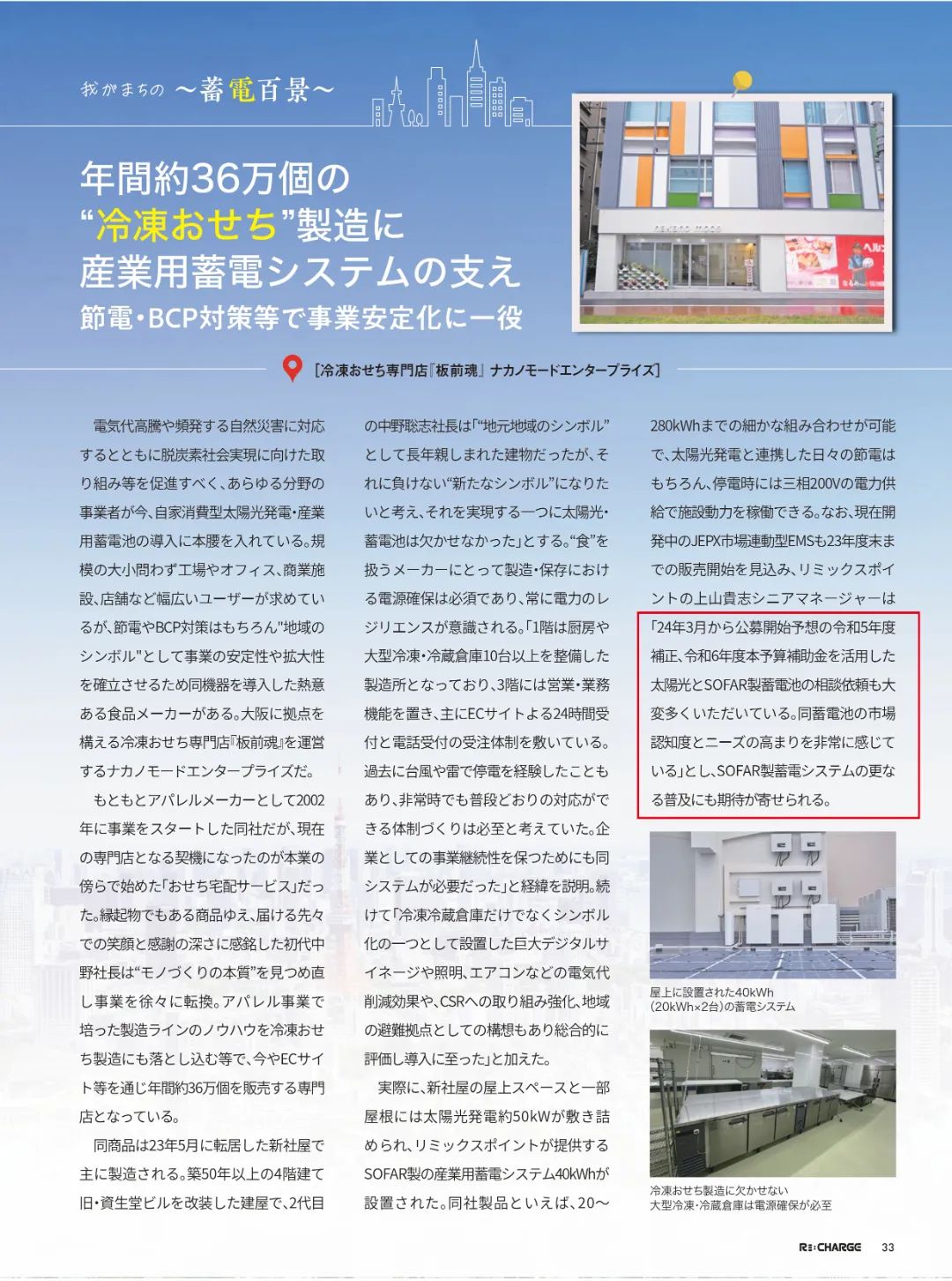 关于从事"食物"的制造商来说,生产和生涯时的电源包管是必不可少的,必需时刻关注电力的韧性。。。。。。。。"一楼是厨房和10多台大型冷冻冷藏库组成的生产区,三楼是营业和营业功效,主要通过电商网站实现24小时接单和电话接单。。。。。。。。已往曾因台风和雷击导致停电,因此建设在紧迫情形下也能如常应对的体制是当务之急。。。。。。。。为了维持企业的事业一连性,这套系统也是须要的。。。。。。。。" Nakano Mode公司前社长中野先生说道。。。。。。。。